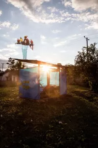 Growing up as the granddaughter and niece of farmers, she spent most of her childhood on ranches, swimming in lakes and rivers and in long car trips to small towns in Peru. When she was a child, she was fascinated by a story that was told to her about a man who had died from a plane crash in the Peruvian Amazon. His little daughter had survived the crash and made her way to find help after a few days of wandering through the jungle. This story became an obsession of hers, and while little, she would play in her garden pretending she had survived a plane crash. She spent hours creating water puddles with water from a hose to simulate rivers, making dolls out of mud and preparing salads made with leaves and flowers. Now, as an adult, Macarena takes pictures and juxtaposes them with photographs of herself as a little girl to recreate this inner world she had while growing up. She tries to show these surreal situations that in her world were totally realistic. The result is a colorful habitat, a playful scenery which reminds us of our own childhood.