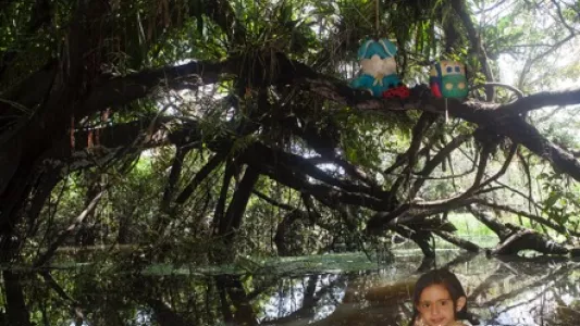 Growing up as the granddaughter and niece of farmers, she spent most of her childhood on ranches, swimming in lakes and rivers and in long car trips to small towns in Peru. When she was a child, she was fascinated by a story that was told to her about a man who had died from a plane crash in the Peruvian Amazon. His little daughter had survived the crash and made her way to find help after a few days of wandering through the jungle. This story became an obsession of hers, and while little, she would play in her garden pretending she had survived a plane crash. She spent hours creating water puddles with water from a hose to simulate rivers, making dolls out of mud and preparing salads made with leaves and flowers. Now, as an adult, Macarena takes pictures and juxtaposes them with photographs of herself as a little girl to recreate this inner world she had while growing up. She tries to show these surreal situations that in her world were totally realistic. The result is a colorful habitat, a playful scenery which reminds us of our own childhood.
