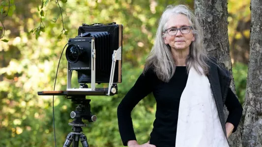 Barbara Bosworth (American artist, educator and photographer, 1953-) is an internationally-renowned photographer whose large-format images explore both overt and subtle relationships between humans and the rest of the natural world. Whether chronicling the efforts of hunters or bird banders or evoking the seasonal changes that transform mountains and meadows, Bosworth's caring attention to the world around her results in images that similarly inspire viewers to look closely. Bosworth grew up in Novelty, Ohio. She currently lives in Massachusetts, where she is a professor emeritus of photography at the Massachusetts College of Art and Design in Boston. Over her long career, she has photographed in both black and white and color. Her single images display a generous attention to small facts, while her large-scale triptychs reveal a panoramic awareness, one that lets viewers glimpse relationships between frames across a wide field. While all of Bosworth's projects remind viewers not only that we shape the rest of nature, but that it also shapes us. Her work has been widely exhibited, notably in recent retrospectives at the Denver Art Museum in Colorado, Peabody Essex Museum in Salem, Massachusetts, the Smithsonian American Art Museum in Washington, D.C. and the Phoenix Art Museum in Arizona. Her publications include The Heavens (Radius Books, 2018), The Meadow (Radius Books, 2015), Natural Histories (Radius Books, 2013), Trees: National Champions (MIT Press; Center for Creative Photography, University of Arizona, 2005) and Chasing the Light (Nightwood Press, 2002). In a San Francisco MoMA interview, the photographer asserts that her processes are slowed down due to the use of film, and that the care and thoughtfulness put into her work increases with that time. She takes her time carefully studying the landscapes, which primarily consists of forests, birds and the people her work has crossed paths with. Like other landscape photographers, Bosworth's declared interest is in exploring the world at her own pace and appreciating what nature puts in front of her. She believes that observation is necessary to the artistic process and end product. Although she examines what appears before her in the natural world, Bosworth's chosen subject matter remains very personal and depicts specific moments that she has experienced. Her first photographs in and around her home in Ohio were taken from her rectangular living room window, looking out into the Ohio forest. Although her earliest photographs rarely included humans, she increasingly focused on people's connection to and effects on the surrounding environment, and she often mentions her parents and her upbringing as influences. Barbara's mother developed Parkinson's disease and dementia, while her father passed away from old age. Bosworth was able to channel these experiences into her work, drawing on them as an inspiration for her book Behold: "Photography is our validation that we were there" (2014). The multi-awarded artist often reveals the sacredness of the land through her work, in a subdued and ironic way. Her images are tranquil and transcending, uncomplicated and immediate. For Bosworth, who has taken photos for more than 40 years, photography is an act of capturing things that are disappearing and a tool that allows her to reflect on life and death.