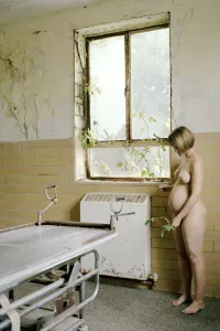 , Sudhoff explores her “role as a new mother and references [her] continued dependence on medical intervention.” While experiencing an anxiety ridden pregnancy due to prior medical concerns, she staged self portraits to reveal and narrate her changing body and attitude towards the idea of motherhood. Her work often reflects a fascination with medical environments and she remained true to that by shooting in an abandoned hospital. Sudhoff interacts very differently with her environment in