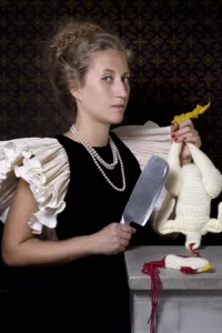 In recent years, Daniela has included knitted and crocheted objects into her work. She states, in her artist statement, that she originally used them to represent “a variety of subjects, from the creation of a safe place to an obsession channeled in an attempt to preserve mental health of a creation that destroys and consumes its creator, “like Frankenstein’s monster”.” Now she uses them to make soft, absurd representations of almost anything.